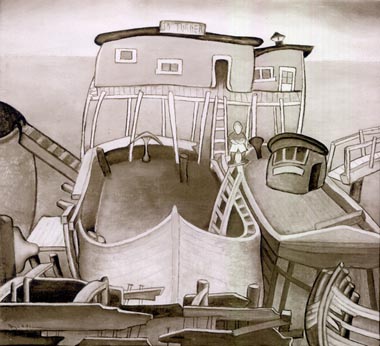 It is one of a series of boat paintings she produced as landscapes in response to advice from New York galleries to make her work more commercially viable. The Opportunity Gallery, which was associated with high profile artists including Walter Pach, John Sloan, Georgia O’Keeffe, Rockwell Kent, Robert Henri, and Charles Demuth who acted as exhibition “Czar”, specifically advised Hutchinson to paint landscapes to break into the speculative New York art market. The strategy worked, and though she never exhibited at the Opportunity Gallery, she did begin to sell work and draw media attention at exhibitions such as the Washington Square sidewalk show.