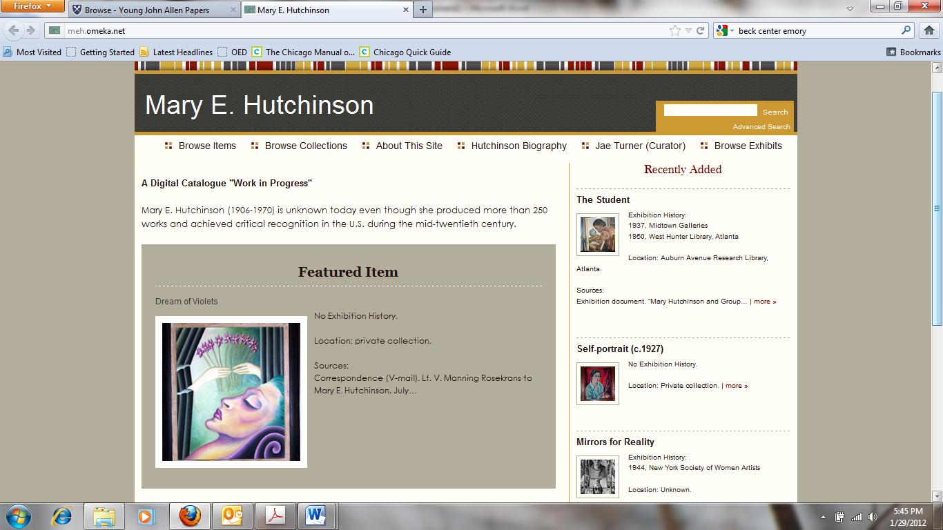 This project emerged out of my 2010-11 fellowship with the Emory University Woodruff Library and my dissertation research. It is an on-going effort to bring scholarly attention and public awareness to the mid-twentieth-century American artist, Mary E. Hutchinson. The site utilizes the Omeka content management system developed by George Mason University’s Center for History and New Media.