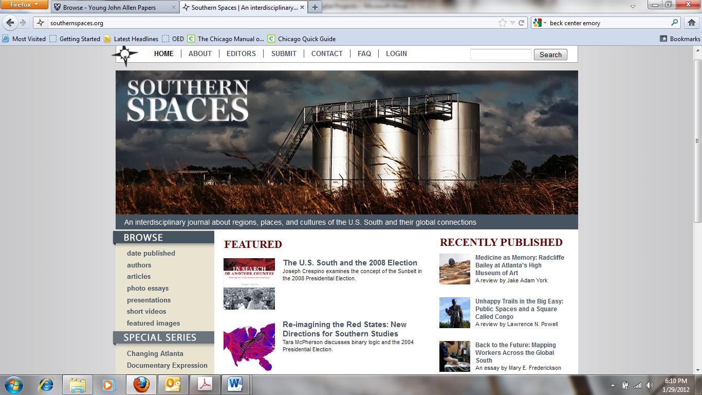 As a Woodruff Library Fellow (2010-11), I worked with the editorial team of Southern Spaces. I gained practical experience in digital scholarly publishing from the initial review process to layout and multimedia integration.